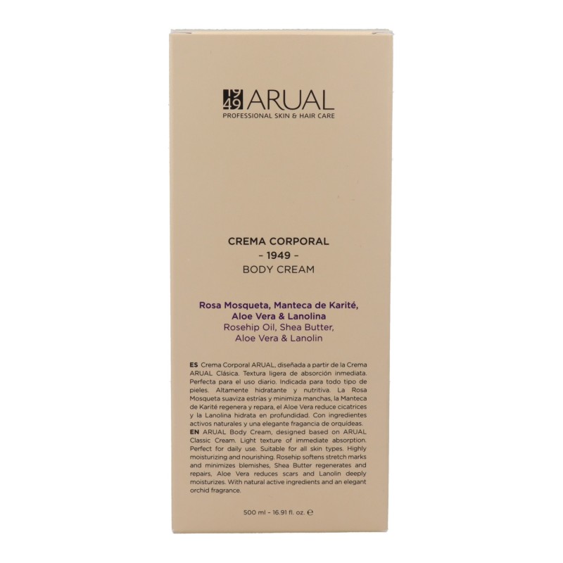 Crema Corporal ARUAL, diseñada a partir de la Crema ARUAL Clásica. Textura ligera de absorción inmediata. Perfecta para el uso diario. Indicada para todo tipo de pieles. Altamente hidratante y nutritiva. Benefíciate de las propiedades de sus ingredientes activos naturales. La Rosa Mosqueta suaviza estrías y minimiza manchas, la Manteca de Karité regenera y repara, el Aloe Vera reduce cicatrices y la Lanolina hidrata en profundidad. Consigue una piel suave, uniforme, luminosa y déjate embriagar por su elegante fragancia de orquídeas.