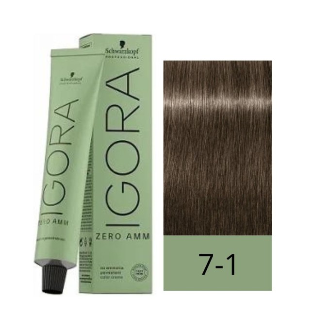 El tono 7.1 Rubio Medio Ceniza 100% libre de amoníaco de IGORA ZERO AMM es una coloración permanente en crema que puede usarse para todo tipo de técnicas de color con unos resultados optimizados. Su fórmula sin amoníaco contiene la Tecnología Phytolipid, una combinación de pigmentos específicos y una mezcla de aceites micronizados naturales que sellan los pigmentos del color para unos resultados duraderos, naturales y fieles a la carta de color, sin el desagradable olor a amoníaco.